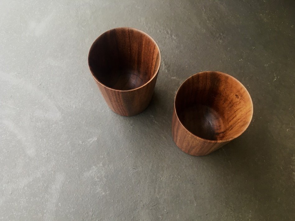 Beautifully hancrafted upcycled walnut cups finished with mineral oil. Design by Mónica Santos for Loja.